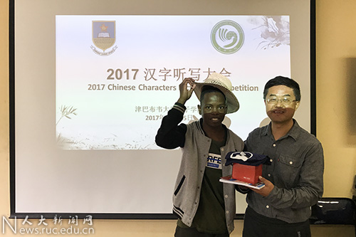 经过激烈的角逐,五名同学脱颖而出,获得本次比赛的冠亚军,他们是孙立伟(二年级)、Ewaculate(三年级),天佑(三年级)、马晶晶(三年级)、Calvin(二年级)。其中,二年级的孙立伟同学以接近满分的成绩夺得了本次比赛的第一名。津巴布韦大学孔子学院中方院长为获奖选手颁奖。