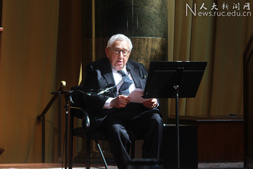 基辛格在做主题发言时首先回忆了48岁第一次访华时与周恩来总理的对话,他说当时的中国对他来说是个谜。伴随着后半生他近百次地往返大西洋两岸,时至今日,中国的成就远远超乎他的想象,而中国对于他来说却不再是个谜。他指出,中国国内的发展发生了深刻变革,其中有三大节点,毛泽东为中国带来了大团结,邓小平带来了改革开放,习近平提出了”中国梦”。