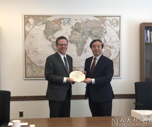4月3日上午,杜鹏一行访问乔治城大学,与乔治城大学副校长汤姆·班切夫(Tom Banchoff)座谈。汤姆·班切夫回顾了两校交流历史,两校在法学、哲学等诸多领域有着密切交流。杜鹏对两校的交流合作成果表示肯定,他介绍了中国人民大学的学科特点和优势,在社会学、经济学、国际关系等领域均与乔治城大学具有潜在的合作可能性。同时,学校近期成立的高瓴人工智能学院也为合作提供了新的机会。此外,杜鹏还介绍了人民大学丝路学院、暑期小学期及全英文硕士项目等情况,并希望两校在长短期学生交换、科研合作、共同举办会议等领域加强合作。乔治城大学美中国际问题交流中心主任托娅乌兰(Tuoya Wulan)参加座谈。