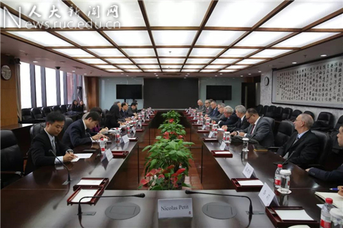 25日上午,法方代表团成员与中法学院中法双方团队一起,分别与中国人民大学相关学院领导就开展教育交流与科研合作进行了深入讨论。数学学院院长郑志勇、信息学院党委副书记张国富在信息楼会见了让·尚巴兹、塞尔日·弗迪达,就合作开办“中法理科实验班”的设想进行了深入探讨,黎玖高、中法学院法方代表魏让方(Jean-François Vergnaud)出席了会见;校长助理、哲学院院长郝立新,历史学院院长黄兴涛、党委书记刘后滨在人文楼会见了帕特里克·基利、阿兰·达龙、夏睿思,就合作开办“中法人文实验班”的设想进行了深入探讨;商学院院长毛基业、党委副书记叶康涛在明德商学楼会见了吉·马赫西亚、文森·蒙日马丁,就双方在师资和学生交流、课程合作方面的设想进行了深入探讨。