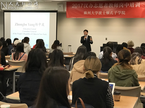麻州大学波士顿孔子学院院长孙柏凤发表《我们的使命》致辞,随后,全体志愿者教师唱响了汉语教师志愿者之歌《瀚宇之花盛开》,深情壮丽的歌声再次激发出全场人员为汉语教育事业奋斗的使命感。杨中波为志愿者教师带来祖国的关怀。他表示,对外汉语教学这些年的快速发展是所有汉语教育工作者共同努力的结果,相信大家在培训中会有更多收获,感谢孔子学院为组织此次培训付出的辛勤劳动。
