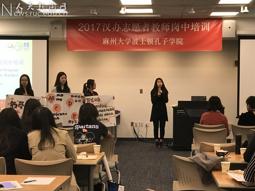 孔子学院中文项目负责人王淑红对培训安排作了说明。培训课程包括主题讲座和分组讲座。在主题讲座环节,高健以《Rhyme It! Act It! Speak It!》为题,重点展示了“歌谣教学法”的效果和运用技巧;李兆红的讲座则以《TPRS教学法在课堂中的实际运用》为题,从TPRS与传统教学法的比较、TPRS在课堂操练中的可行性及TPRS对提高学生中文语言能力的有效性几个方面,介绍了TPRS教学法。在分组讲座中,张华介绍了关于混合教学模式的基础知识,分享了一些具有划时代意义的教学工具和策略,并提出了差异化教学和个性化学习的概念和方法;王淑红着重向志愿者教师介绍了汉办各类教学资源、实用教学辅助工具,以及新技术工具与平台;陆熙雯主要介绍了美国现行主流外语教学大纲和标准,以及如何掌握与学校其他外语老师沟通的工具,了解外语教学本质,轻松应对课程设计任务;施祖慰从学校对教师的预期和评价及其相互关系出发,分析了学校对教师的期望种类以及原因,对教师教学评价的演变和当今的特点,以及美国高中课程、教学、学生评价的特点;杨明和陈丽嘉从课堂管理入手,同志愿者教师分享了如何运用简单微妙的策略构建积极的课堂环境和可控的纪律准则。分组讲座由学员根据名额自行选课听讲,之后有专门的时段供学员分组分享所听讲座内容,讲座老师分别听取学员反馈,检验学习效果。在最后一天的培训中,学员代表王慧莹、刘航、张怡娜分别以《中文小书设计与实践》《汉字教学》《“非中国特色”的仪式感》为题进行了自己在美国教学实践的“教学分享”。所有参加培训的志愿者教师分为十个小组,针对本次培训内容,进行了各种形式的培训成果展示,并由讲师现场点评。选课与分享,以及最后一天的培训成果展示与讲师点评,是孔子学院为提高培训效率和效果特别设计的培训方式,受到学员好评。