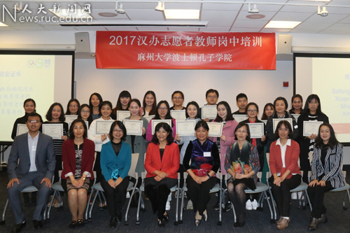 最后,孔子学院中方院长付春梅主持结业式,孔子学院院长孙柏凤对培训进行了总结。志愿者教师代表李娜娜分享了培训感言。经小组推荐和讲师组现场评选,孔子学院为志愿者教师颁发了小组成果展示“突出贡献奖”和“最佳展示奖”。志愿者管理教师林秀琴、李明和李馨为志愿者教师颁发了结业证书。