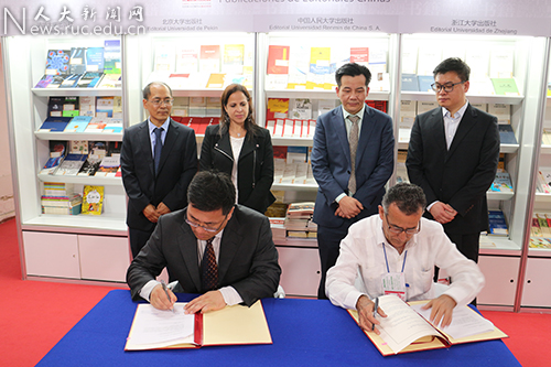 2月1日,人大社与古巴何塞·马蒂出版社在中国主宾国活动区签署了《古船》西班牙文版权转让协议。2月2日,在中国国家新闻出版广电总局副局长周慧琳、中国驻古巴大使陈曦、古巴文化部长阿贝尔·普列托和古巴图书委员会主席胡安·罗德里格兹·卡布雷的见证下,中国人民大学出版社社长李永强与古巴新千年出版社赫尔曼·海素斯社长签署了古巴新千年出版社加入“一带一路”学术出版联盟的合作协议。人大社还与古巴人民教育出版社签署了《中国新教育》出版协议、与古巴文艺与文学出版社签署了《一个人的聚会》出版协议,是本次中国主宾国书展活动签约最多的出版社。