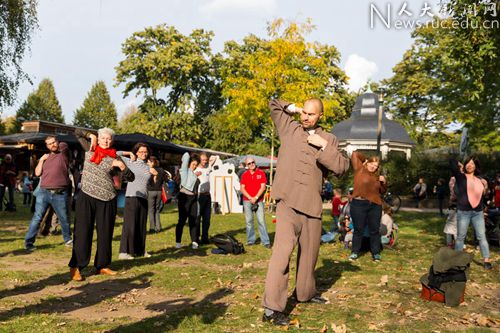 此外,孔院还特邀了一位长期习练中国武术的德国师傅Andreas Gran,向孩子们传授太极课、气功课和防卫术。这位德国师傅不仅在国内先后拜师多位中国武术师傅,还曾获孔院奖学金赴北京体育大学学习,因而中国话也说得相当地道。