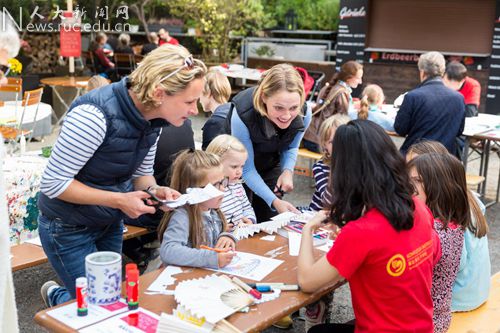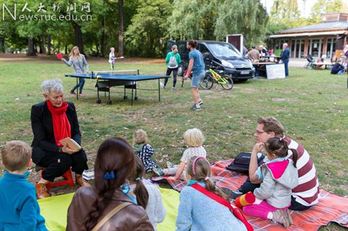 而在音乐亭正前方偌大的草坪上,还开展着朗诵会与体验汉语课。朗诵会主要是面对孩子们的中国文化故事朗诵,而讲者却是一位对中国传统文化颇感兴趣的德国当地人。绘声绘色的故事朗诵让孩子们笑得乐不可支,也让他们从中领会到了不少中国文化。同样也是在草坪上开展的,还有体验汉语课。这堂短短半个小时的体验课由孔院一名经验丰富的中国老师执掌,该老师借助丰富有趣的游戏活动寓教于乐,也吸引来了不少孩子和家长。