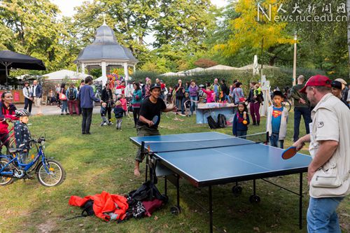 天朗气清,惠风和畅,场外的活动还不止于此,更有踢毽子、舞彩带、中国扇、太极球、乒乓球、幸运转盘、京剧脸谱摆拍。为此,孔院专程运来了两台乒乓球桌,置于草坪中间,不仅孩子们乐此不疲地争相打球,很多德国年轻人也纷纷加入阵中。