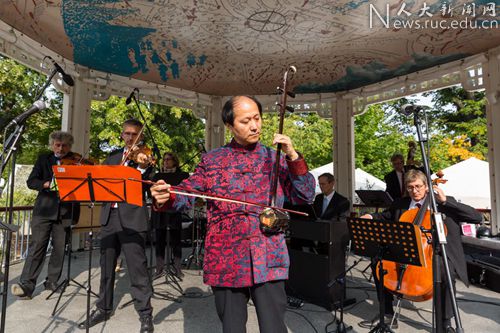 在莱比锡中方院长杜荣老师和外方执行院长岳拓先生热情的开场致辞之后,首先献上表演的是旅居德国多年的中国传统艺术家陆建国老师领衔Neue Salonorchester 乐团带来的二胡及交响乐。中西合璧的视听觉双重享受,伴着莱比锡迷人的秋色,让台下所有的听众都沉浸其中。
