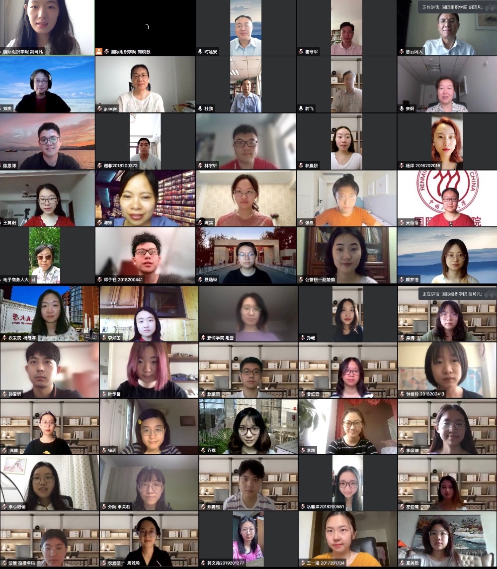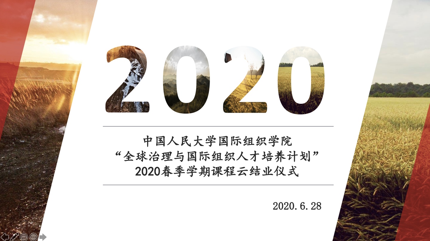 6月28日,中国人民大学国际组织学院举行“全球治理与国际组织人才培养计划”2020春季学期课程云结业仪式。中国人民大学副校长、国际组织学院院长杜鹏、前联合国开发计划署(UNDP) 高级别官员、国际组织学院授课教师薛玉雪、中国人民大学社会与人口学院教授、国际组织学院授课教师刘爽、中国人民大学经济学院教授、国际组织学院授课教师程大为、中国人民大学农业与农村发展学院教授、国际组织学院授课教师陈敏鹏、中国人民大学国际组织学院副院长、招生就业处副处长郭琴、中国人民大学国际组织学院副院长崔守军、中国人民大学国际组织学院副院长来炯以及国际组织学院“全球治理与国际组织人才培养计划”第一期学员参加结业仪式。结业仪式由中国人民大学国际交流处处长、国际组织学院执行院长时延安主持。