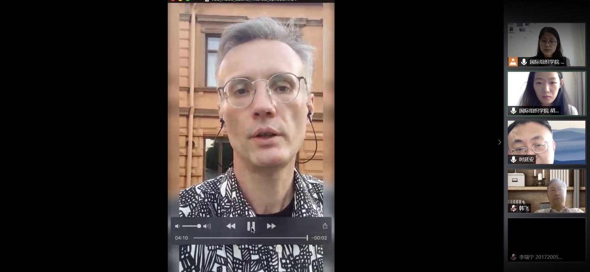 国际组织学院授课教师Fred Dervin老师、程大为老师、刘爽老师先后发言。Fred Dervin老师以视频方式分享了他的授课感受。他表示,很荣幸能够参与到中国人民大学国际组织学院“全球治理与国际组织人才培养计划”中。在本学期的授课中,虽然与同学们有着距离和时差,但同学们都能够踊跃参与,积极地对课堂内容进行讨论。国际组织学院的学生肩负着时代的责任,希望同学们在未来能够更好地讲述中国故事,让世界听到更多的中国声音。