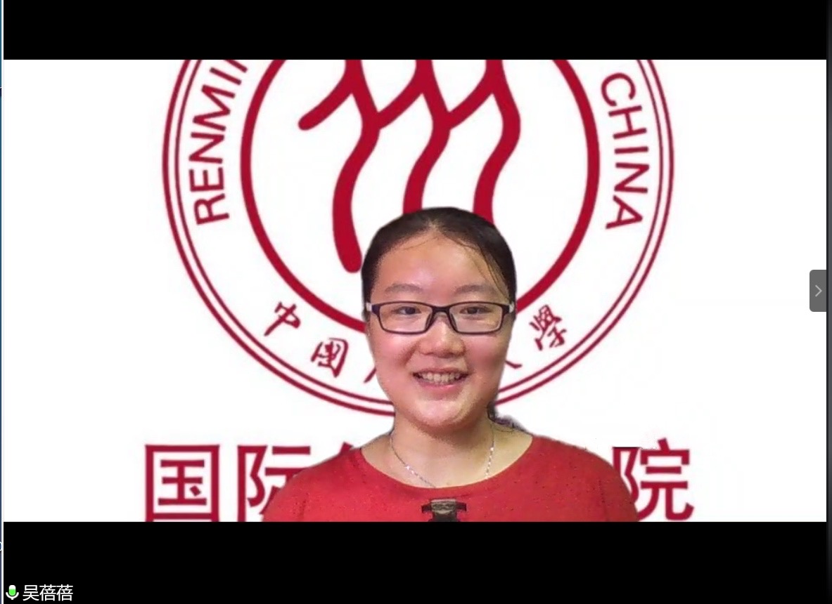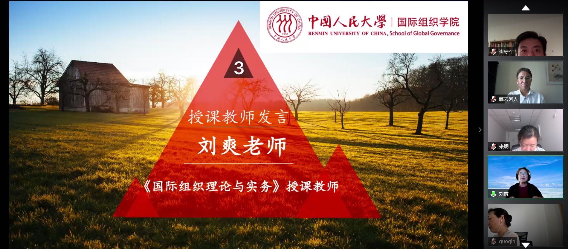 刘爽老师在发言中表示,本学期的线上授课模式对老师和学生都是全新的尝试和体验,本学期的课程能够顺利完成离不开大家的共同努力。中国人民大学为学生提供了许多开拓眼界、学习提升的机会。每一位同学都是中国人民大学的一张名片,希望各位同学能够继续努力,提升个人能力,未来在国际组织中展现人大学子的别样风采。
