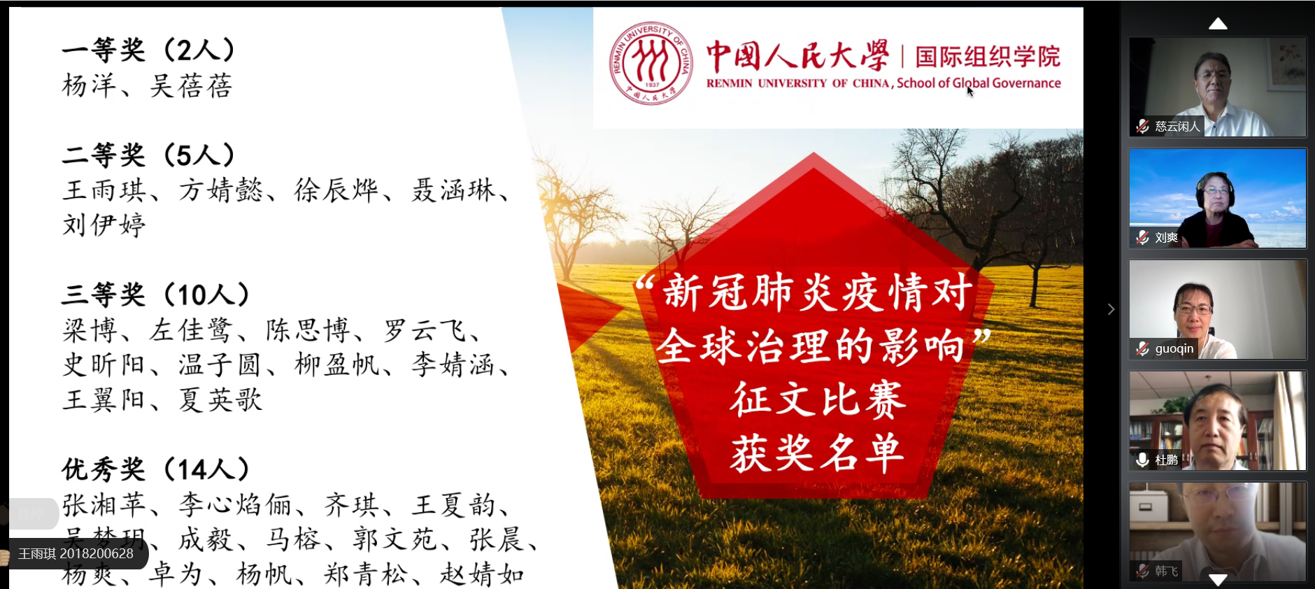 随后,时延安院长宣读了由学院举办的“新冠肺炎疫情对全球治理的影响”征文比赛获奖名单。