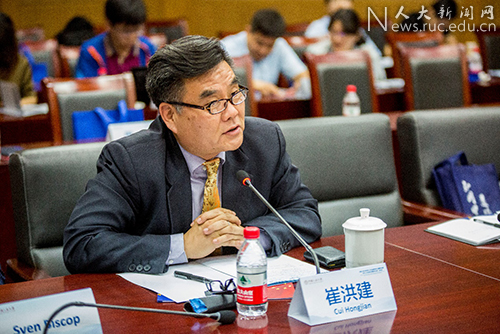在主旨发言环节中,国务院参事、中国人民大学国际关系学院教授时殷弘,中国社会科学院学部委员、中国欧洲学会会长周弘,国际问题研究院欧洲所所长崔洪建,比利时皇家国际关系研究所教授Sven Biscop,布鲁塞尔荷语自由大学教授Florian Trauner,“让·莫内”讲席教授、中国人民大学欧盟研究中心主任王义桅就“人文交流与中欧关系”发表了精彩发言。