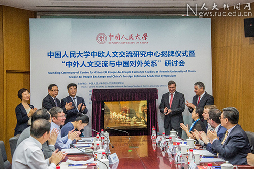 6月5日上午,中国人民大学中欧人文交流研究中心揭牌仪式在逸夫会堂举办。中国人民大学校长刘伟、教育部中外人文交流中心副主任杨晓春、欧盟驻华大使史伟(Hans Dietmar Schweisgut)、比利时驻华大使马文克(Marc Vinck)、欧盟驻华使团文化教育参赞马庆(Marcin Grabiec)、中国人民大学国际交流处处长时延安、中国人民大学科研处副处长刘金龙、中国人民大学国际关系学院党委书记牛彤、中国人民大学国际关系学院副院长金灿荣、中国人民大学中欧人文交流研究中心执行主任闫瑾出席了揭牌仪式。中国人民大学中欧人文交流研究中心主任杨慧林主持了开幕式。