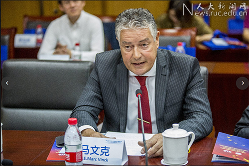 马文克在致辞中表示,自2013年中比人文交流协会成立以来,比利时与中国在文化、教育、旅游、科学、体育和媒体等领域的交流与合作,促使了中比两国人民加深彼此间的了解。未来中比将需继续深化在人文交流方面的合作,尤其是在教育领域,相信中国人民大学人文交流研究中心也将扮演重要的角色。