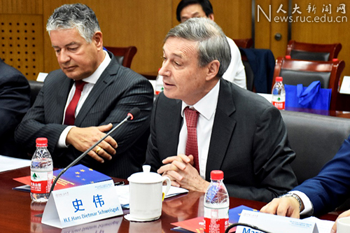 史伟在致辞中对中国人民大学中欧人文交流中心的成立表示祝贺,并对人民大学在欧洲问题研究和中欧关系发展方面的学术贡献给予高度评价。他指出,中欧自1975年建立外交关系以来,历经40余年的发展,中欧在众多领域都开展了深入的合作,人文交流更是其中的一个重要组成部分,2012年,随着中欧高级别人文交流对话机制的建立,人文交流成为中欧关系的第三支柱,历经6年的发展,中欧在人文交流方面也取得了很大成绩,但仍存在一些不足。目前中欧双方都有比较强烈的意愿深化中欧人文交流对话,在这一背景下,中国人民大学中欧人文交流研究中心的成立意义重大,期待中心能充分利用其欧洲研究优势,在推动中欧人文交流方面发挥更加瞩目的作用。
