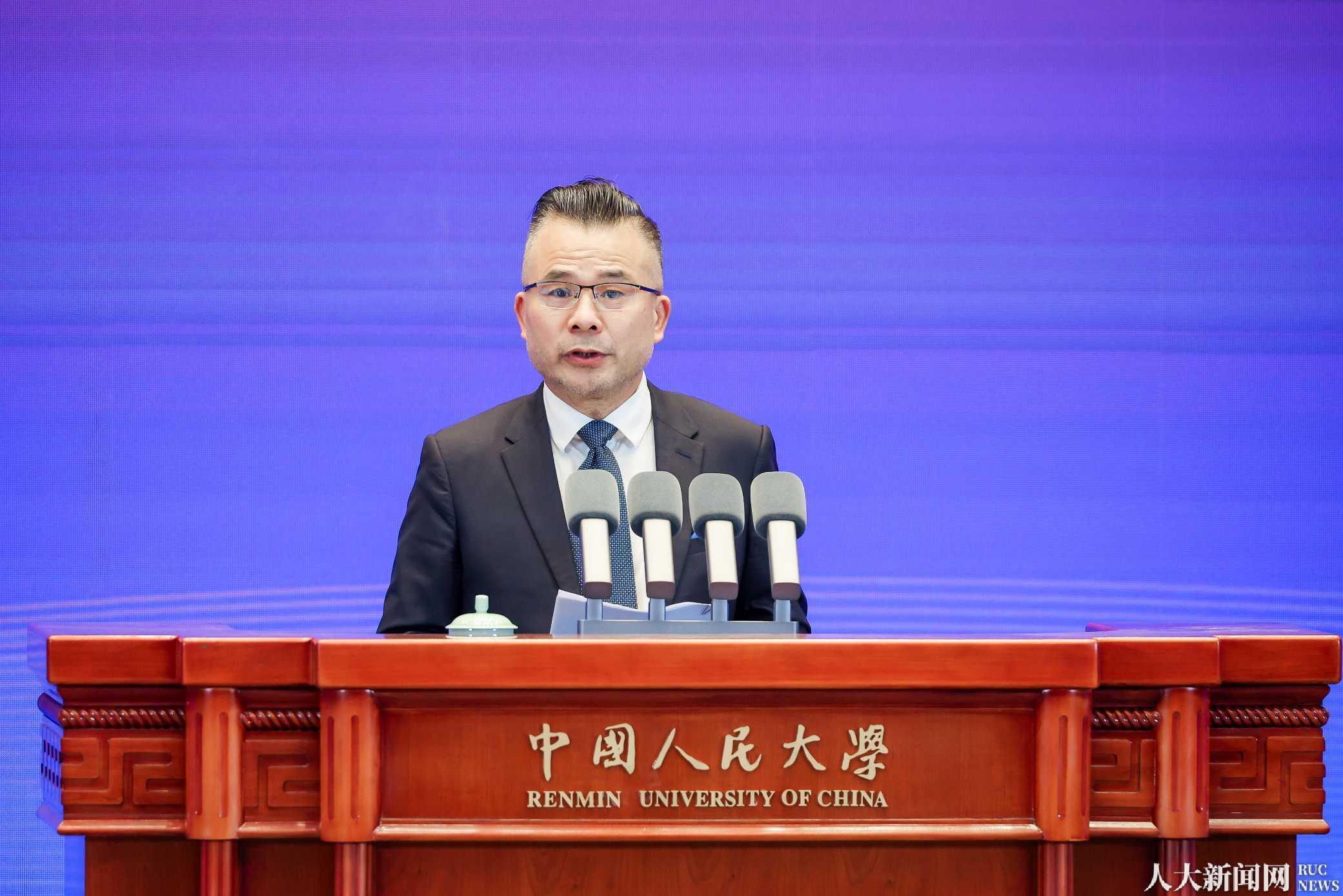论坛以七种语言发布《人与社会全面发展:面向2050年的人类社会发展战略》报告。中国人民大学副校长郑新业介绍报告内容。