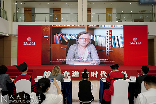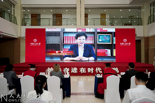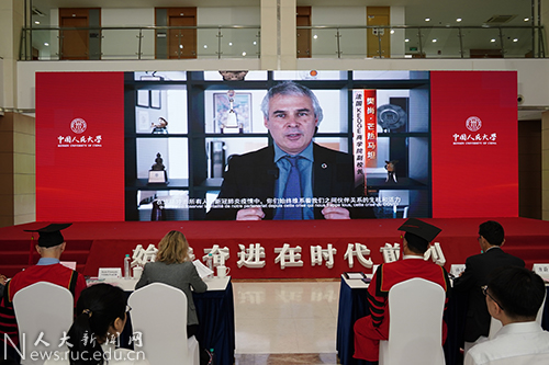 中国人民大学党委书记靳诺代表学校作视频致辞,副校长、苏州校区管委会副主任、丝路学院院长杜鹏通过视频宣读学位授予决定,副校长朱信凯出席,国际交流处副处长李贞实、招生就业处副处长陈姚、审计处副处长兼新校区建设总审计师平兴莉、新闻学院副院长韩晓宁,法国驻上海总领事馆教育领事Séverine BOUÉ(白丽娜),苏州校区党委书记方蔚玮和领导班子成员靳兴初、祁萱、王宝奎、朱婷、布超、万静、江晓丽以及教师代表、家长代表、校友代表与毕业生参加活动。