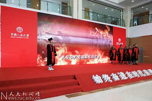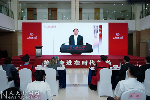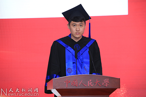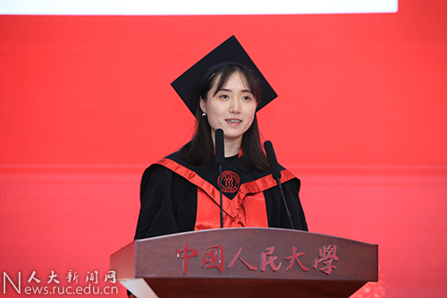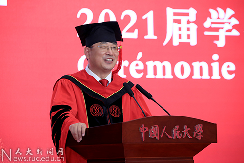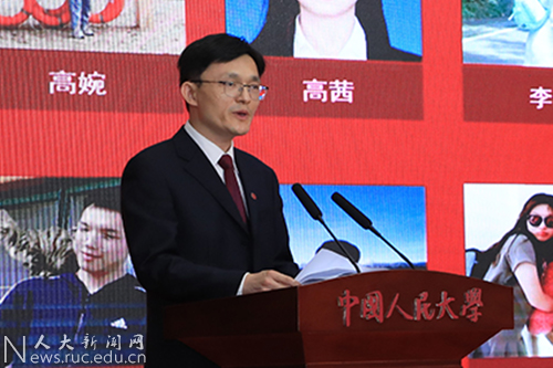 教授李海洋代表教师发言。他表示,我们的时代是有竞争的时代、是有保障的时代、是有公平的时代、是有作为的时代。面对着这样的时代,人大学子没有惶恐,只有从容;没有焦虑,只有奋发。他寄语同学们听从内心的召唤,尽情地挥洒青春和汗水,用努力奋斗去迎接中华民族的星辰大海,壮丽明天。