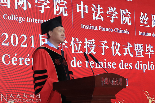 靳诺在致辞中向即将毕业的同学们送上了祝福,向悉心培养同学们的老师和辛勤养育他们的父母致以敬意,向法国合作院校、法国驻华使馆、苏州市政府表示感谢。靳诺表示,苏州校区作为中国人民大学提升国际性的重要窗口以及面向国际探索中外合作办学和培养高端人才的试验基地,培养了一批具有国家情怀、世界眼光的优秀人才。同学们在校学习的这几年,世界正经历百年未有之大变局,新冠肺炎疫情影响广泛而深远。在这样的时代背景和历史进程中,同学们站在中西方文化交流的前沿,不仅努力学习、奋斗进取,锻炼了本领,增长了见识,更沉着冷静应对了疫情带来的严峻挑战,我们共同见证了同学们脚踏实地的辛苦付出和孜孜不倦的勤学苦读。相信这段求实探索奋进的人大经历,必将成为烙印在未来生命中的厚重底色。