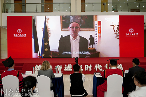 法国索邦大学副校长 Alain Tallon(阿兰•达龙)发表视频致辞。他祝贺全体毕业生收获硕果、取得学位,并祝福同学们在学业中再接再厉,在职业生涯中一往无前。他表示,索邦大学的校友几乎遍布全世界各个国家,毕业生们未来可以获取索邦大学校友网络的全面支持,并希望未来很快能与各位同学重逢相聚。