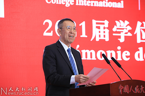 朱信凯向国际学院、中法学院、丝路学院2021届毕业生致以问候和祝福。他表示,今年正逢中国共产党成立100周年,作为与新时代共同前进的一代,同学们要坚定理想信念,担当起时代赋予人大青年的重要使命。他对毕业生提出三点希望:一是实事求是,小事做起,始终保持脚踏实地;二是兼容并蓄,勇于创新,始终保持初心不忘;三是终身学习,增长才干,始终保持胸怀天下。最后,他期待同学们勇敢肩负起时代赋予的重任,将自己的梦想与激情始终同国家的发展同向而行,志存高远,脚踏实地,努力在实现中国梦、世界梦的生动实践中放飞青春梦想。