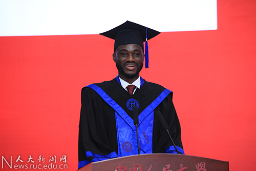 丝路学院毕业生代表Richard Mensah(孟礼达)代表丝路学院毕业生发言。他说,感谢丝路学院把来自不同学科和国家的青年领袖和专业人士聚集在一起,为求知和文化交流搭建优秀平台。在丝路学院,留学生们通过讲座、研讨会、企业参访和文化活动等方式,对中国的发展经验和“一带一路”倡议有了深入的了解。在深入了解中国的发展经验后,他期望广大毕业生能为中国和各自国家的合作共赢和良好关系保驾护航。
