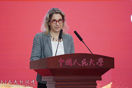 Séverine BOUÉ(白丽娜)在致辞中表示,中国人民大学中法学院是中国境内十七所中法学院中最为重要的一所。就学生规模而言,它是中国第一大中法学院、中国规模最大的法语教育基地以及中外合作办学最为重要的项目之一。她回顾了中法学院取得的成绩,特别是在克服新冠肺炎疫情带来的困难中作出的努力。她为同学们毕业于这样一所知名大学而感到骄傲,并希望同学们成为中法两国伙伴关系的关键桥梁和中法友谊的重要使者。