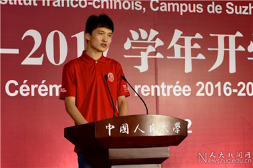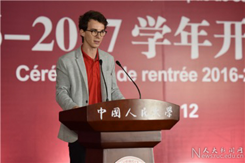 留学生新生代表Quentin LELIEVRE发言,表示会在留学期间认真学习科学知识,努力了解和体会博大精深的中国文化,并与中国的同学们建立起深厚的友谊,在学习生活中,互相借鉴,互相帮助,一同探索前行。