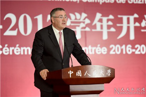 Pierre DEMEULENAERE副校长在致辞中介绍了索邦大学的办学历史和发展现状。他表示,在全球化的今天,索邦大学及其他两所法国高校与中国人民大学的教育合作具有重要的意义。在合作过程中,中法学院同学们的表现非常优秀,严谨活泼的性格和刻苦钻研的精神令人印象深刻,这让中法合作高校双方的合作基础和意向更加坚定和明确。他感谢同学们的辛勤努力,并祝愿同学们在未来取得更大的进步。