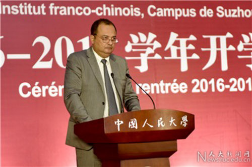 中国人民大学校长刘伟、副校长伊志宏,法国KEDGE商学院校长Thomas FROEHLICHER、董事会副主席Guy MARCILLAT,巴黎索邦大学副校长Pierre DEMEULENAERE,保罗-瓦莱里大学副校长Anne-Marie MOTARD、副校长Maud MORLAAS,法国驻上海总领事馆教育领事Fabien CHAREIX,苏州市政协副主席张跃进,苏州工业园区工委委员、管委会副主任、苏州独墅湖科教创新区工委书记丁立新,苏州独墅湖科教创新区管委会常务副主任蒋卫明等出席开学典礼。苏州校区2016级全体新生、教职工和部分新生家长参加典礼。