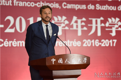 Fabien CHAREIX先生在致辞中对中法学院的办学成绩表示高度赞赏,他感谢法国三所高校和中国人民大学的工作团队在推进中法教育文化交流方面做出的突出贡献,并祝愿同学们在即将开始的国际化学习过程中,获得美妙的学习体验并学有所成。