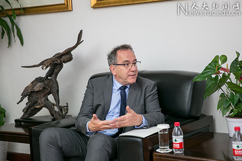 中国人民大学校长助理、中法学院院长黎玖高,国际交流处处长张晓京,国际交流处副处长李贞实,国际学院副院长石佳友,中法学院法方代表魏让方(Jean-François Vergnaud),中法学院法方办公室主任慕建民(Alain-James Palisse)参加会见。