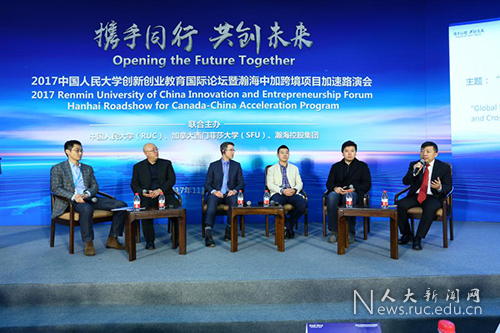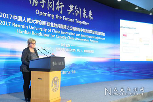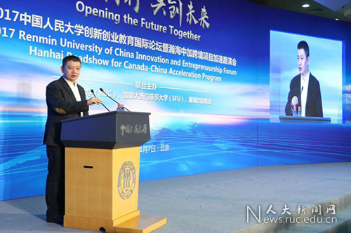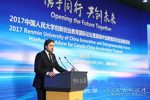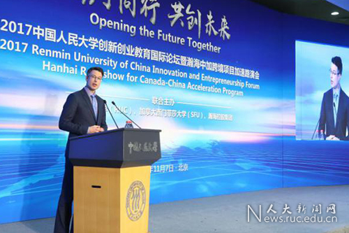 11月7日,中国人民大学、加拿大西门菲莎大学、瀚海控股集团联合举办、中国人民大学创业学院承办的“携手同行、共创未来”2017中国人民大学创新创业教育国际论坛暨瀚海中加跨境加速路演会举行。