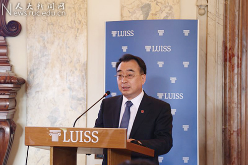 吴付来在签约仪式上致辞。他表示,与意大利LUISS大学共建的“中国馆”将开启人民大学与意大利高校交流合作以及中意两国人文交流合作的新篇章;将为意大利人民,特别是青年学生打开一个认识中国、了解中国的窗口,为当前日益频繁、深入的中意人文交流搭建一个长效、有影响力的平台,从而进一步增进两国人民相互理解,深化两国传统友谊。今后,两校将更好地利用这一平台,开展形式多样的学术交流、人员交流和出版交流活动。