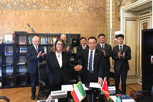 在中国驻意大利大使馆教育参赞罗平、安德烈·普伦奇佩等人见证下,吴付来与保拉· 塞韦里诺签署了两校学术合作谅解备忘录和学生交换协议,这是两校合作的重大突破,更是双方合作伙伴关系发展的里程碑。