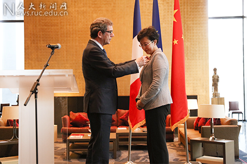 黎想表示,法国国家荣誉军团勋章由拿破仑一世在1802年创立,是法国政府用以表彰在各项事业中作出突出贡献的优秀人士的最高荣誉。“今天向您授予荣誉勋章,是因为您的个人品德、您在工作中的成就,还有您为推动法中两国合作、加深两国友谊所作出的杰出贡献。”他向靳诺和人民大学致以衷心的祝贺。
