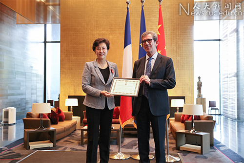 4月26日,中国人民大学党委书记靳诺在法国驻华大使官邸被授予法国国家荣誉军团骑士勋章。法国驻华大使黎想(Jean-Maurice Ripert)代表法国总统埃马纽埃尔·马克龙(Emmanuel Macron)向靳诺颁发荣誉勋章和证书。这是法国政府颁授的最高荣誉勋章,以表彰靳诺对中法高等教育交流与合作所作出的卓越贡献。法国驻华使馆官员、中国人民大学副校长杜鹏出席观礼。