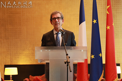 黎想在致辞中指出,长期以来,法国驻华大使馆、法国高等院校与中国人民大学交往密切,共同开展了极具高瞻性的稳定合作。其中,中法学院是由法国巴黎索邦大学、蒙彼利埃保罗—瓦莱里大学、KEDGE商学院与人民大学共同合作创办的第一家以人文社会科学为主的中外合作办学机构,堪称中外合作办学的典范。得益于人民大学在人文社会科学高等教育领域的一流地位,中法学院办学事业蒸蒸日上,培养出了精通法、中、英三语的金融、经济、管理、外语等领域的顶尖人才,为法中两国思想文化交流和人文社会科学发展作出了杰出贡献。