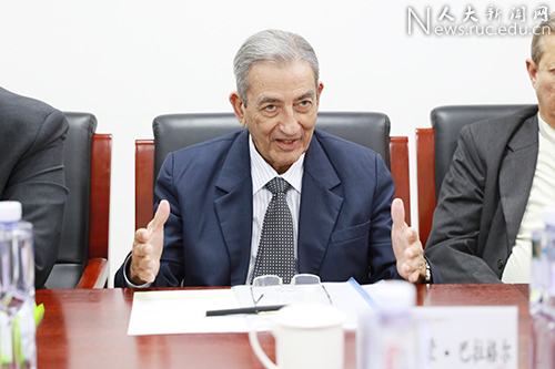 靳诺与巴拉格尔分别代表中国人民大学与古巴共产党代表团互赠纪念品。
