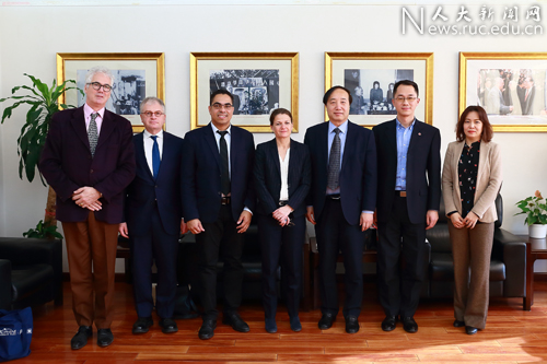 1月17日,中国人民大学副校长杜鹏会见了来访的法国巴黎第九大学(又名巴黎多芬纳大学)校长余一莎(Isabelle Huault)一行。巴黎第九大学副校长艾迪科(Christophe Elie-Dit-Cosaque)、中国事务负责人贝尔纳·费尔南德斯(Bernard Fernandez)、社会与经济学部硕士项目主任戴立德(Denis Darpy)一同来访。