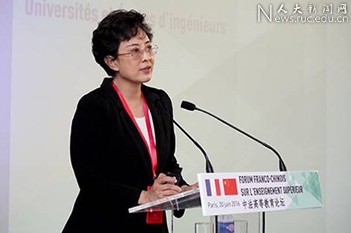靳诺书记作为中方院校代表在论坛上作主旨报告,对中国人民大学中外合作办学经验,尤其是中法学院几年来的建设成果进行总结。她围绕法国在人文社会科学领域的优势以及值得我国人文社会科学建设学习借鉴的经验、中法之间的高等教育合作历史以及双方继续深化教育交流与合作的基础、两国在人文社会科学领域合作办学的机遇和挑战、中国人民大学中法学院的办学经验及发展规划等方面,系统阐述了中国人民大学中法学院作为目前中法间唯一在人文社会科学领域进行合作的办学实践的成果与愿景。靳诺书记表示,中法学院经过第一轮办学周期,积累了丰富的经验,目前正在更加规范与可持续的框架下进行第二轮合作协议的会谈,未来人民大学中法学院的发展将会为中法两国的人文与社会科学交流做出更大的贡献。靳诺书记的发言引起了中法双方高等教育界人士的广泛共鸣。