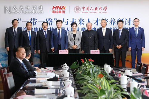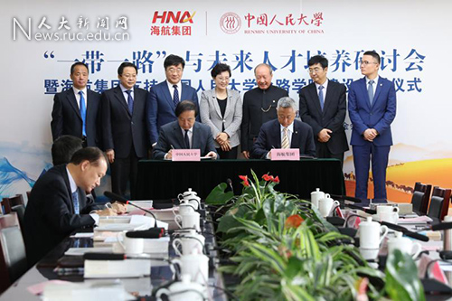 4月26日,中国人民大学与海航集团签署合作协议,并召开“一带一路”与未来人才培养研讨会。双方宣布设立“中国人民大学海航教育基金”,以积极响应国家“一带一路”倡议,共同为“一带一路”沿线国家和地区培养国际化复合型高端人才和未来精英领袖。中国人民大学党委书记、教育基金会理事长靳诺,校长刘伟,常务副校长王利明,副校长、教育基金会副理事长杜鹏,海航集团董事局主席陈峰、副董事长逯鹰出席签约仪式。