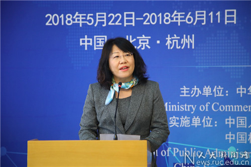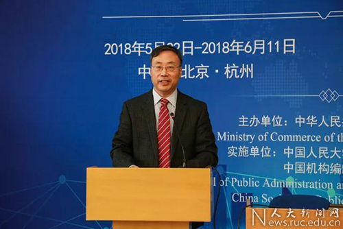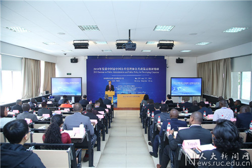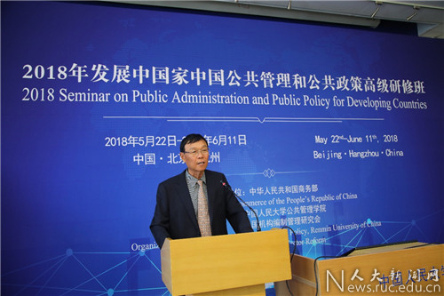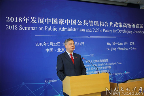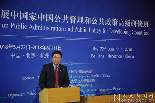 5月22日上午,国家级援外培训项目 “2018年发展中国家中国公共管理和公共政策高级研修班”开班仪式在求是楼四层报告厅举行。此次援外培训由国家商务部主办、中国人民大学公共管理学院承办、中国机构编制管理研究会协办,培训对象为“一带一路”沿线国家以及部分非洲国家的高级官员代表。中国人民大学副校长洪大用,中国机构编制管理研究会执行副会长兼秘书长于宁出席仪式并致辞。