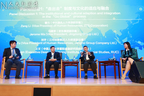 中兴通讯人力资源副总裁曾力、京东集团副总裁马健荣、江河创建集团人力资源副总裁刘宇、中国人民大学重阳金融研究院执行院长王文就“走出去”制度与文化的适应与融合展开了探讨,以中兴通讯的国际化挑战与机遇、京东的国际化征程、江河创建的国际用工经验为题,以劳动法、工会和人力资源管理等问题为具体切入点,为中国企业贡献全球化背景下的“中国经验”。