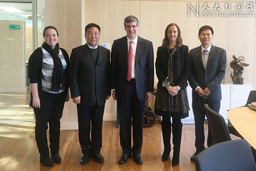 随后,代表团访问了安第斯大学哲学院和文学院,会见了文学院院长Braulio Fernández、文学院教务主管Miguel Donoso、哲学院教师Patricio Domínguez和国际交流处主任Rosario Díaz Domínguez。对方介绍了文学院和哲学院的教学模式,王建平常务副院长对安第斯大学的本科专业课程设置表示赞许,刁克利副院长邀请对方教授来人民大学任教。双方就交换学生的授课模式、教授内容等方面交换了意见。安第斯大学希望尽快签订校级协议和院级协议、落实合作关系。之后,国际交流处主任Rosario Díaz Domínguez、西班牙文学教授Felix Kurt和孔子学院拉丁美洲中心副主任孙新堂教授陪同代表团参观了校园。