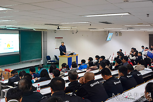 11月8日上午,保卫处(部)联合海淀街道安全生产消防培训学校开展消防专题培训。中国人民大学部分外国留学生、保卫处(部)的微型消防站保安队员、后勤集团各部门安全负责人以及中控室值班员约八十余人参加培训。消防安全宣讲中,海淀街道安全生产消防培训学校赵庆生教官讲授了消防安全知识,双榆树消防中队齐海云警官为大家现场讲解了过滤式自救呼吸器及逃生绳索的性能、用途和使用方法。