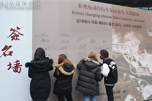 此外,为倡议杜绝电动自行车室内充电问题,在演习现场设立签名墙,师生们纷纷在签名墙上留名,表达自己的承诺和决心。