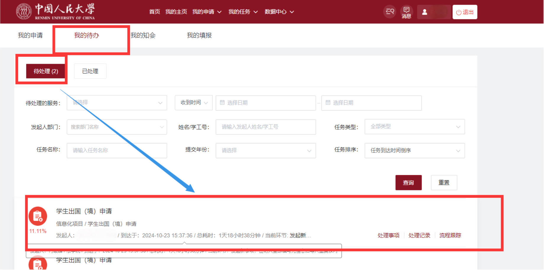 2.由申请人所在院(系)及相关部门进行在线审批,申请人需及时在【我的申请】列表中查询当前审批进度及审批意见。